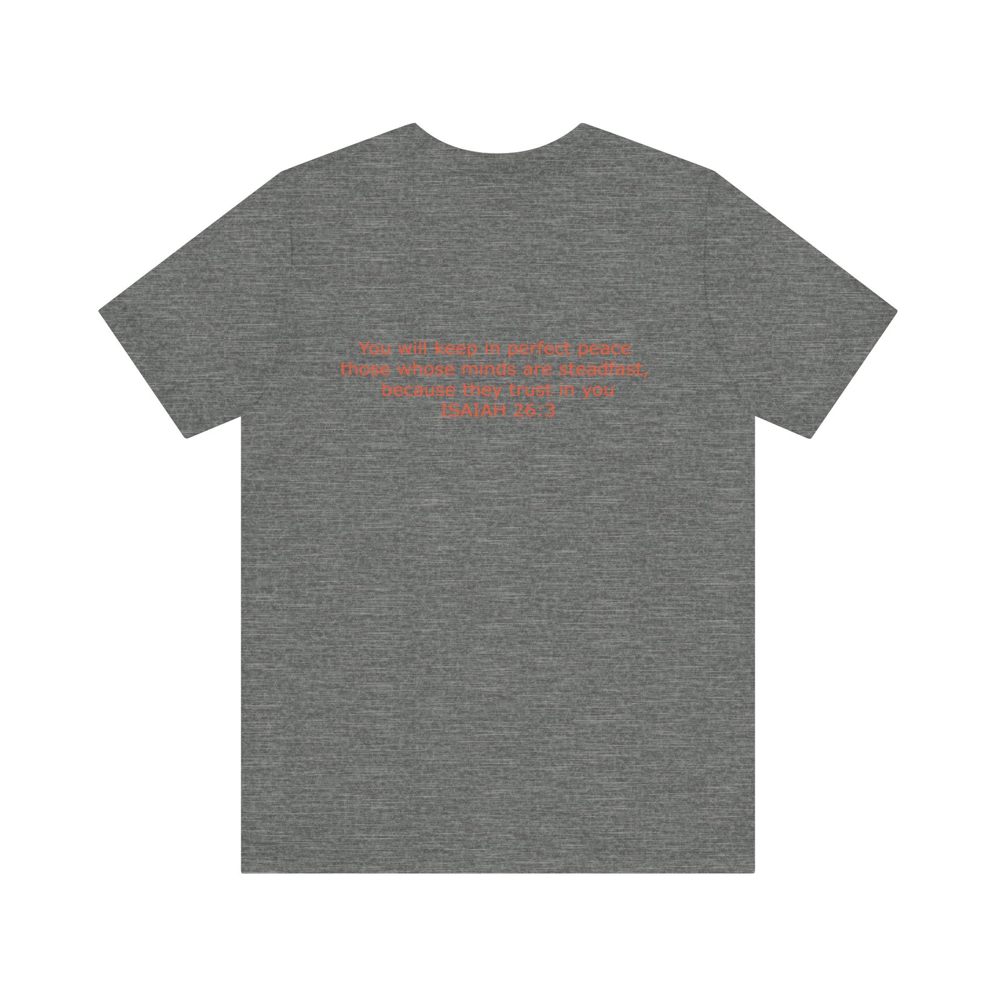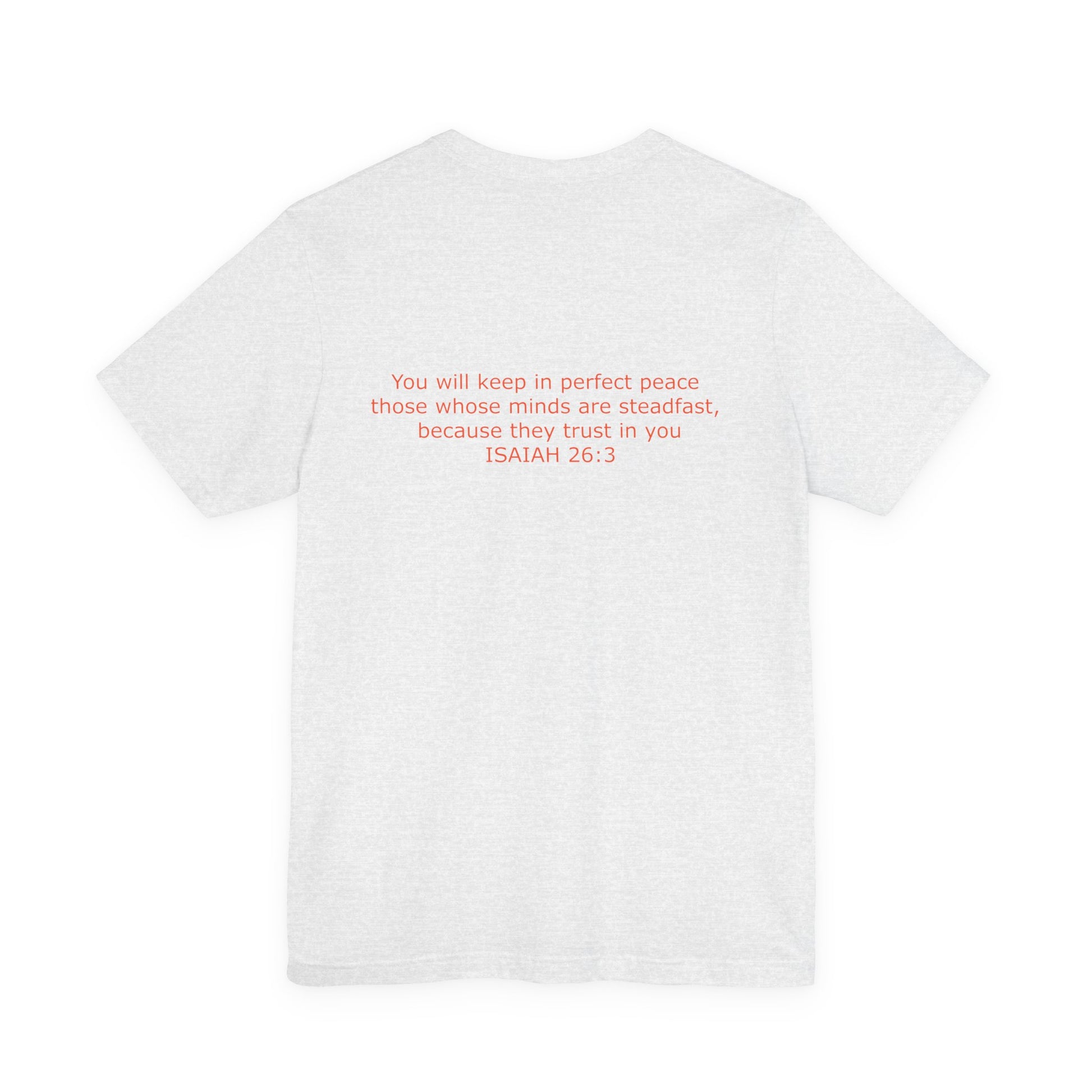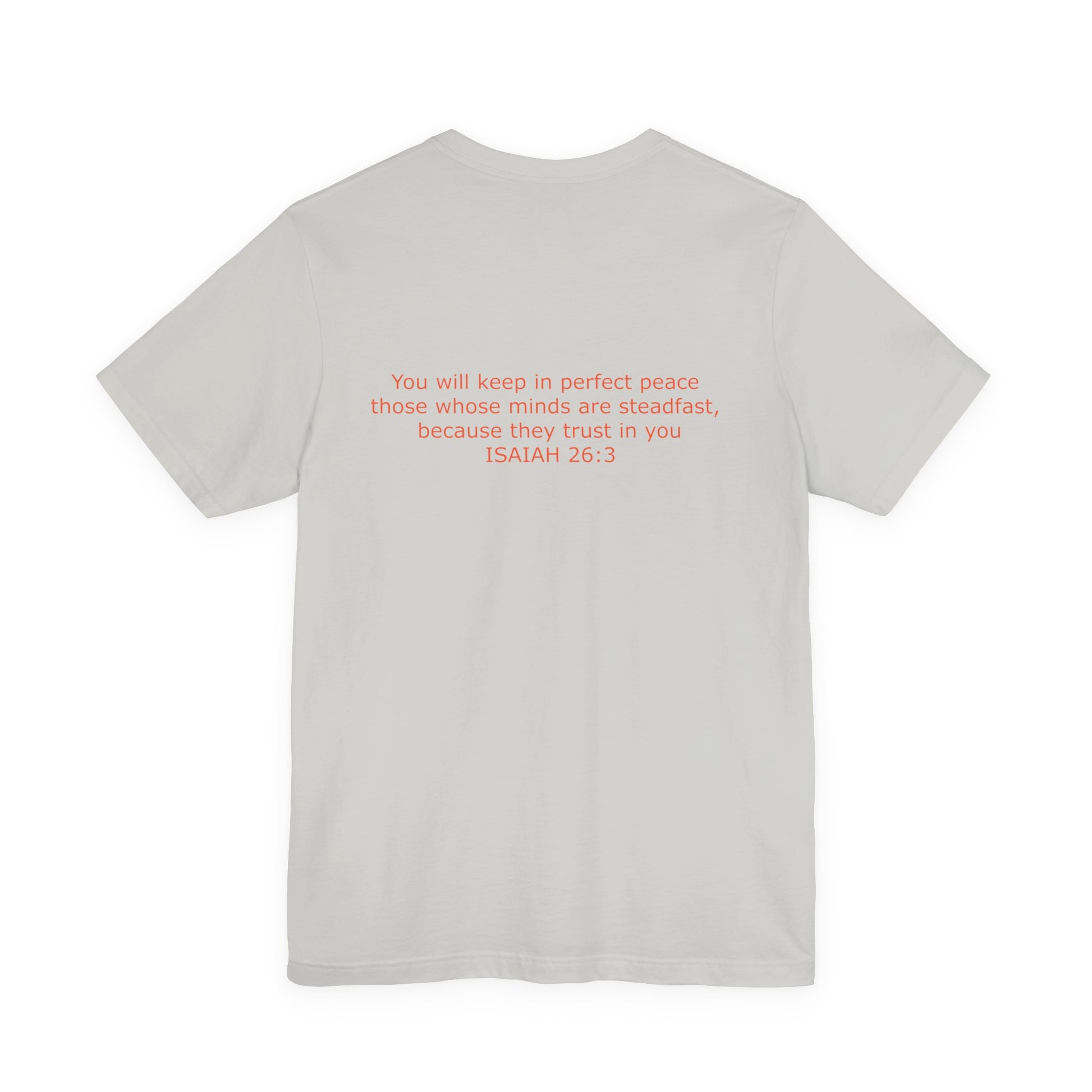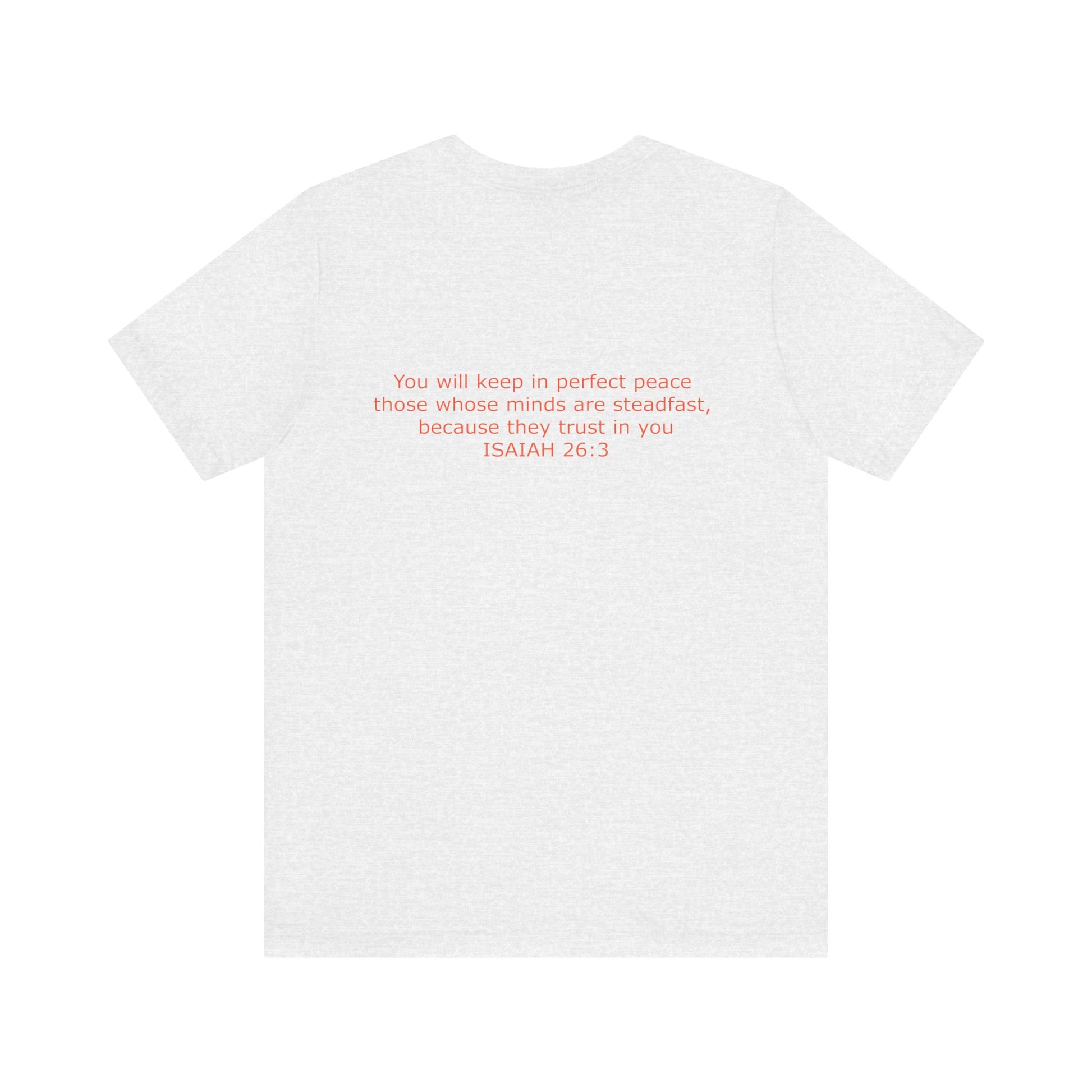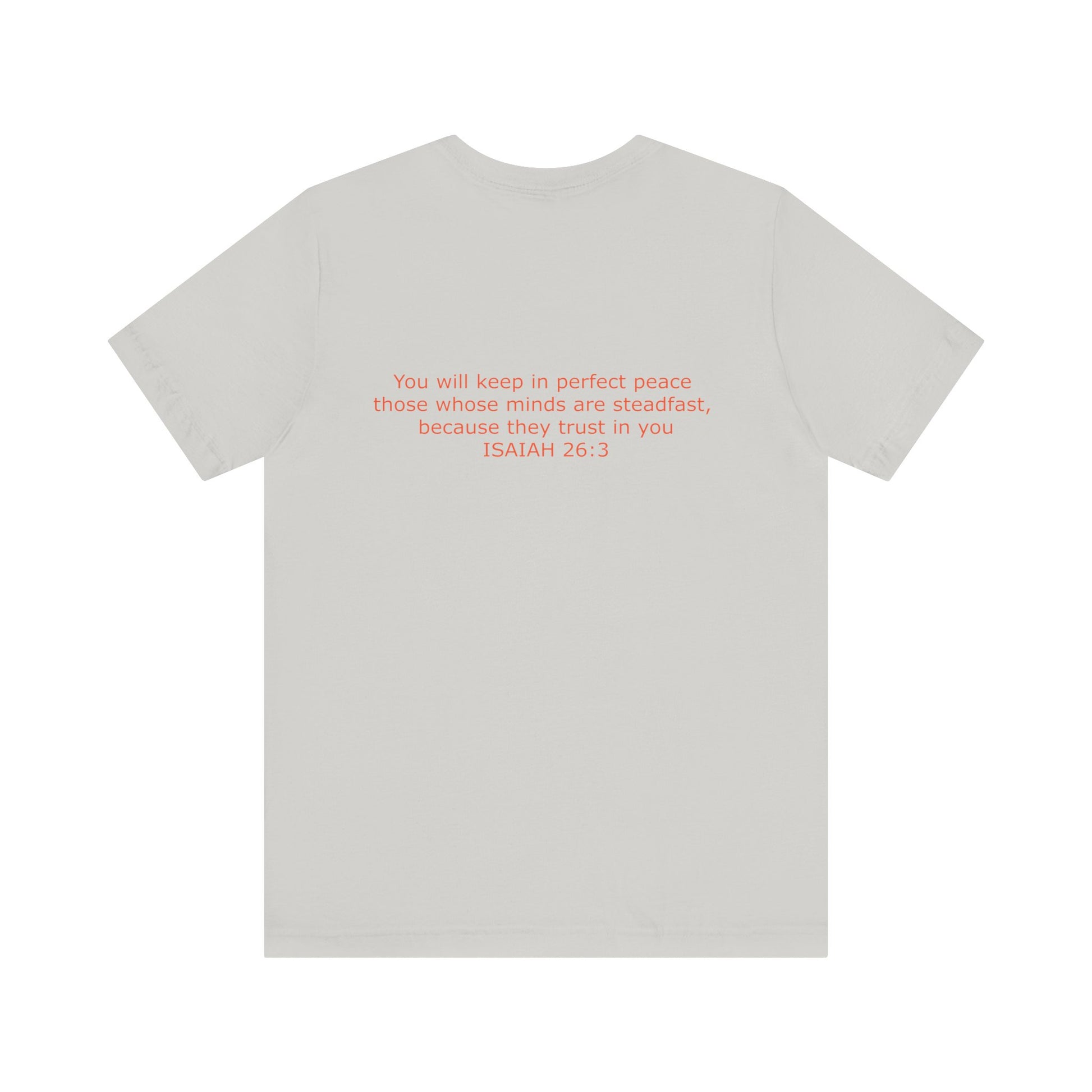 Introducing our stylish Unisex Jersey Short Sleeve Tee. This tee features a color matched Isaiah 26.3 on the back, and our vibrant logo on the front, making it a perfect addition to your casual wardrobe.
