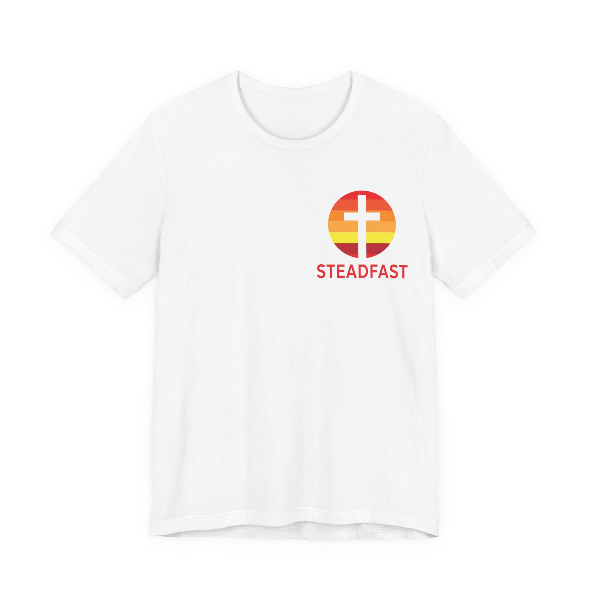 Steadfast Left Chest Red Logo Unisex Jersey Tee with Isaiah 26:3 Verse